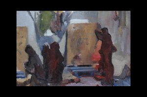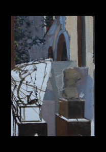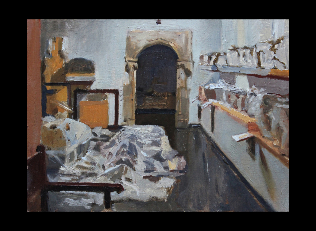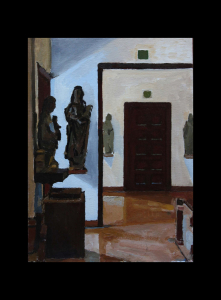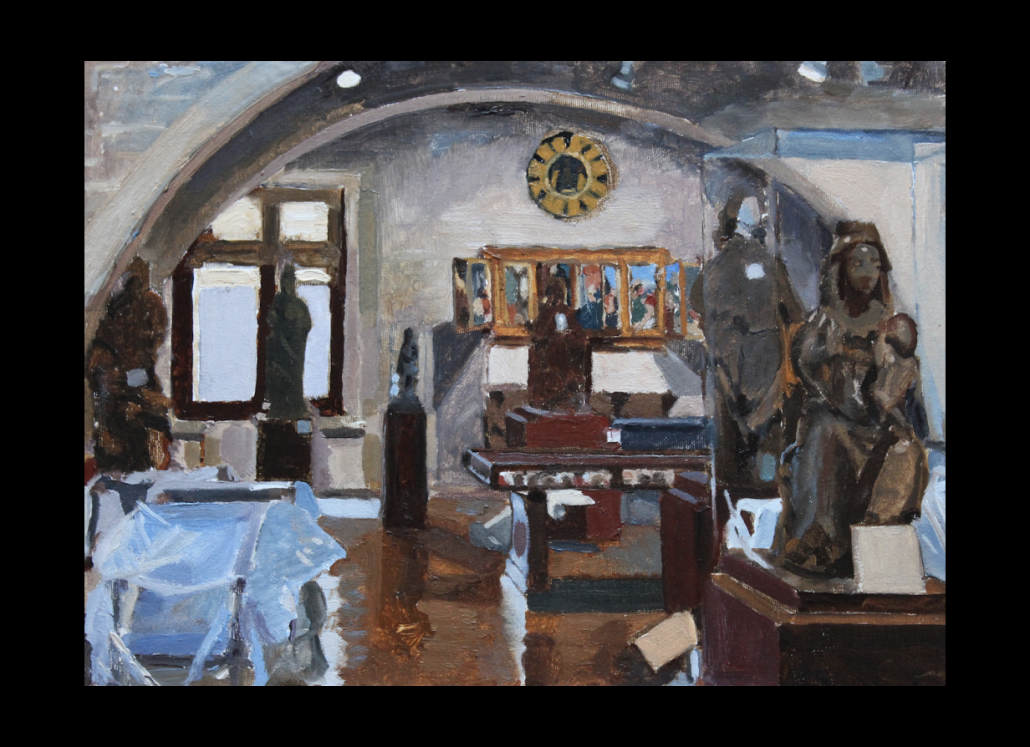 Durante este periodo realicé numerosos apuntes en color de las salas y obras de arte, así como dos cuadros de 1mx70cm, que representan las transformaciones místicas de los mártires cristianos, incluyéndome irónicamente en la imagen como San Bartolomé junto a Santa Lucía.